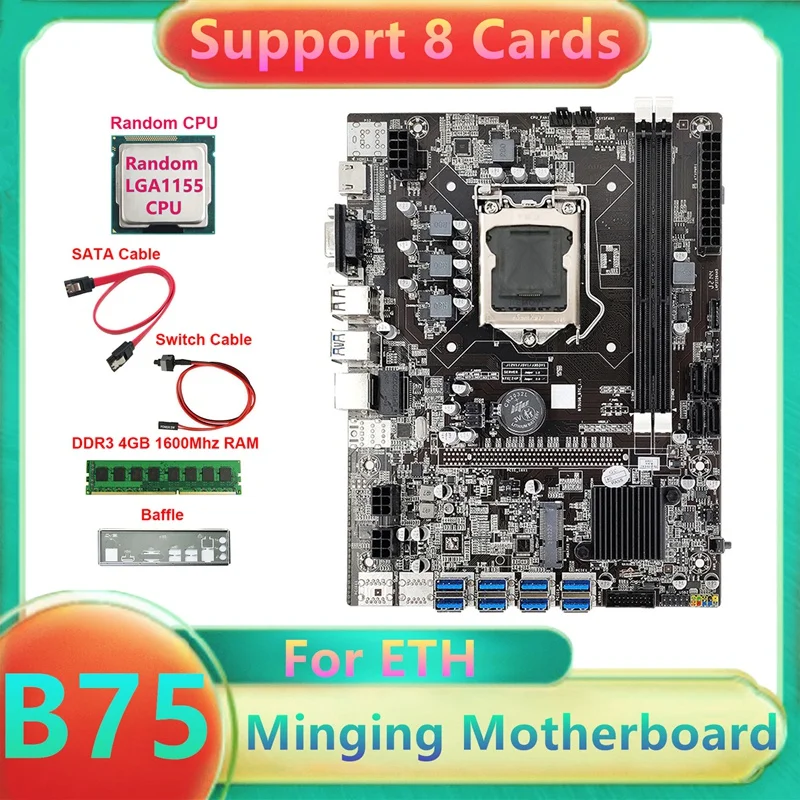 Материнская плата для майнинга B75 8USB ETH + ЦП + DDR3 4 Гб 1600 МГц ОЗУ + переключатель кабеля + SATA кабель + перегородка B75 BTC материнская плата для майни...