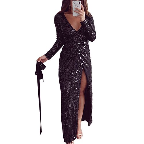 Women's Party Dress Sequin Dress Cocktail Dress Black Long Sleeve Pure Color Sequins Winter Fall Autumn Deep V Fashion Party Winter Dress Evening Party 2022 S M L XL 2XL
