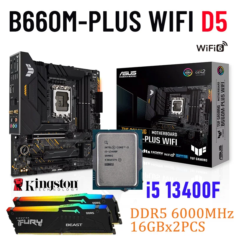 Материнская плата ASUS TUF GAMING B660M PLUS, WIFI, DDR5, разъем LGA 1700, с процессором Intel Core i5 13400F, Kingston, 6000 МГц, 32 ГБ, RGB, подходит