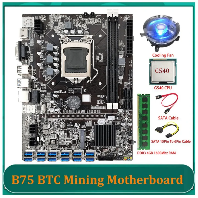 Материнская плата B75 ETH для майнинга 12 PCIE к USB LGA1155 с процессором G540 + DDR3 4 Гб 1600 МГц ОЗУ + вентилятор охлаждения B75 BTC Майнер для майнинга