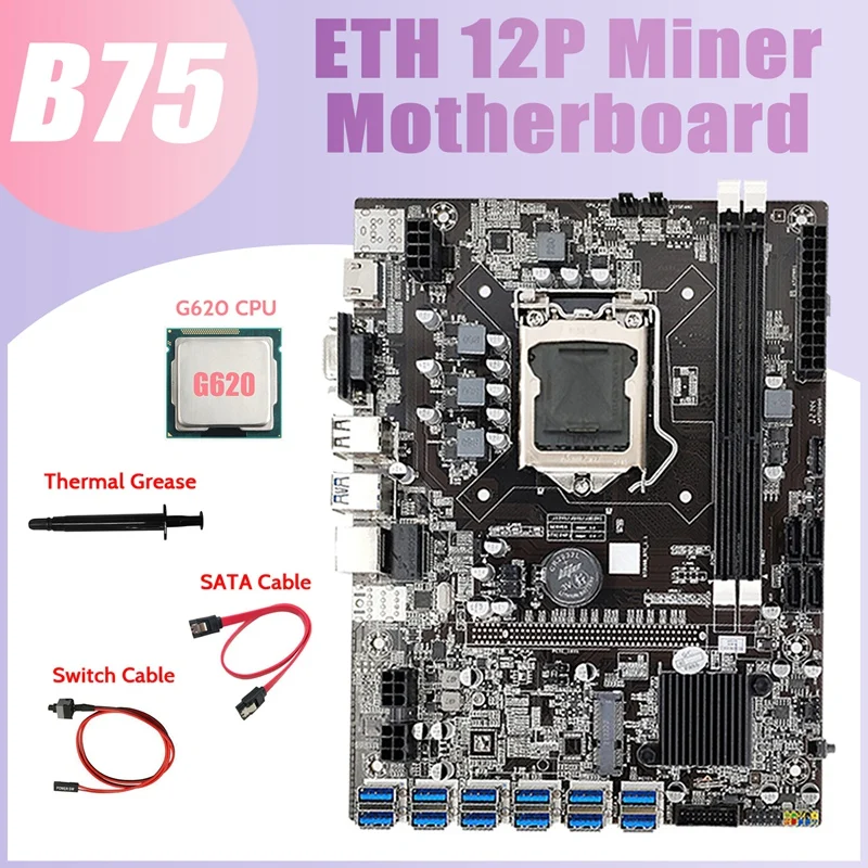 Материнская плата B75 USB ETH Miner, материнская плата 12 PCIE на USB + процессор G620 + кабель переключения + кабель SATA + термопаста LGA1155 B75 BTC