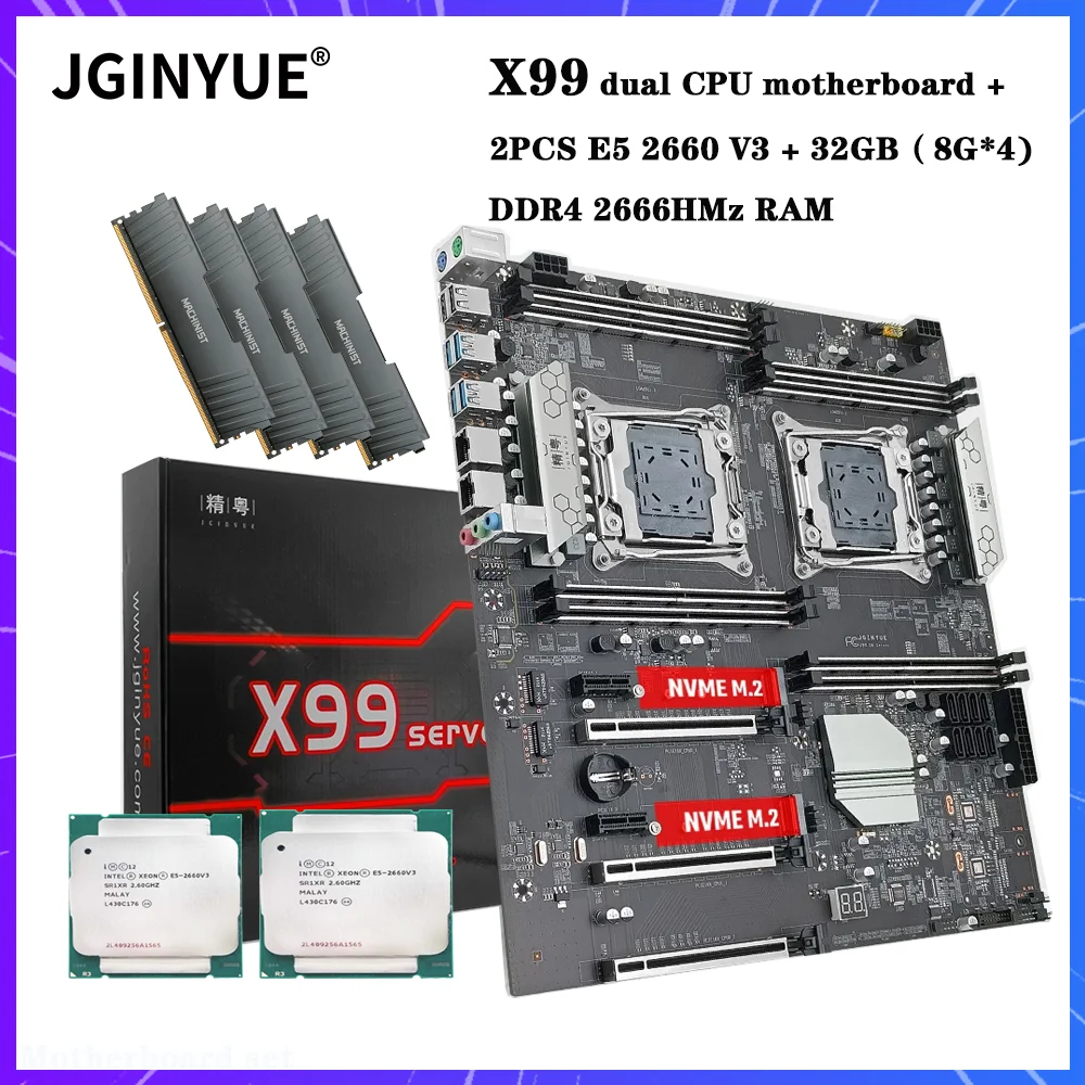 Материнская плата JGINYUE, модель LGA 2011-3, с двумя разъемами ЦП, с процессором Xeon E5 2660 V3 * 2, DDR4, ОЗУ 32 ГБ, NVME M.2