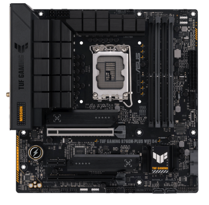 Материнская плата mATX ASUS TUF GAMING B760M-PLUS WIFI D4 (LGA1700, B760, 4*DDR4 (5333), 4*SATA 6G RAID, 2*M.2, 3*PCIE, 2.5Glan, WiFi, BT, HDMI, DP, U, TUF GAMING B760M-PLUS WIFI D4