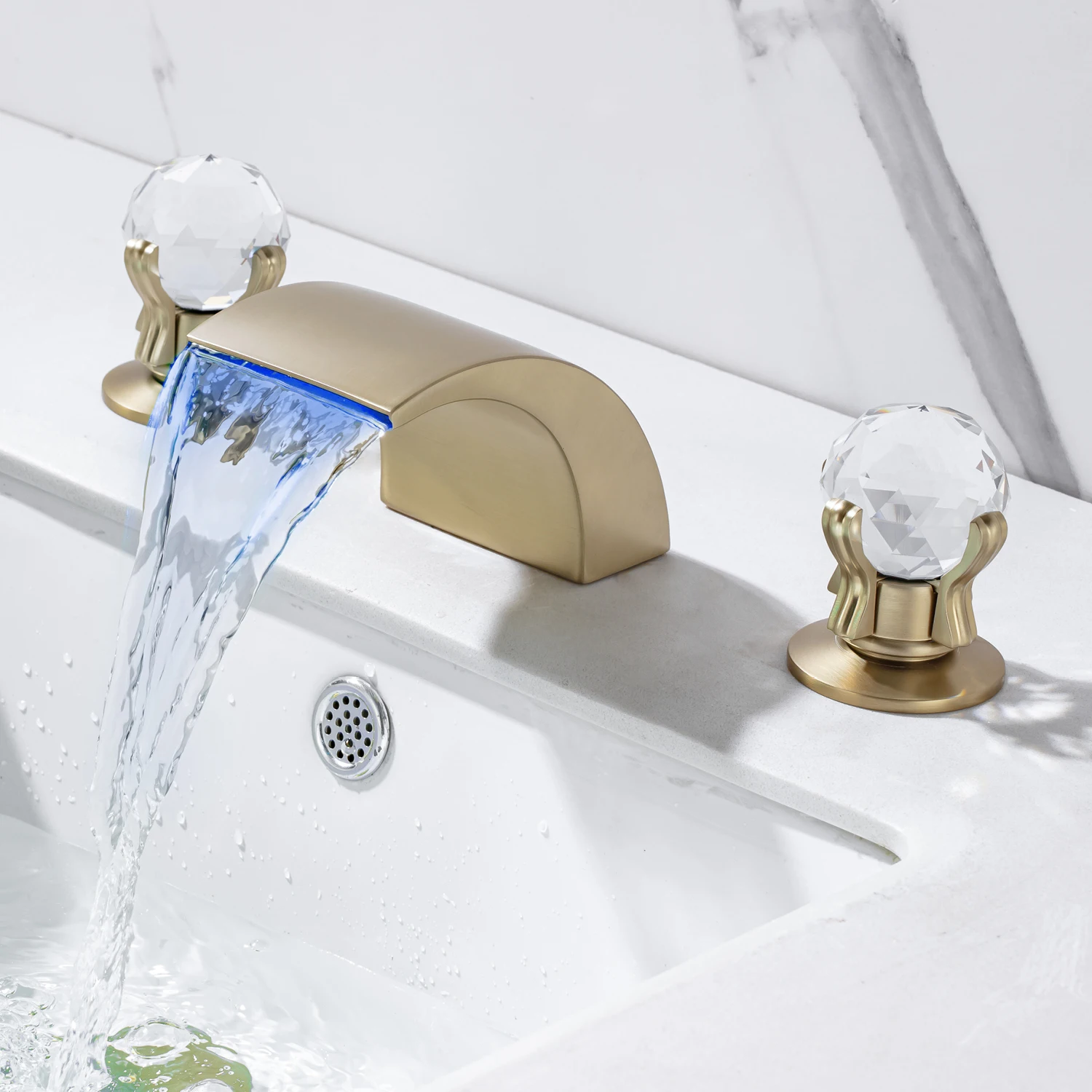 Матовый Золотой смеситель «Водопад» для ванной комнаты, смеситель с 3 отверстиями для раковины, настенный смеситель для туалетного столика с 2 хрустальными ручками