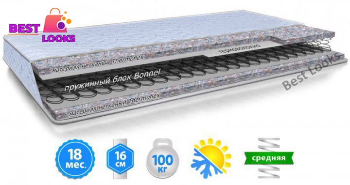 [html]Наполнение:Чехол - стеганый на наполнителе Sprut (2) с волокнами шерсти и хлопка (эффект Зима-Лето), ткань - жаккард (1)Материал нетканый Thermoflex (3)Жесткий настил Thermofelt (4)Зависимый пружинный блок Bonnel (диаметр опорного витка пружины - 75 мм, высота пружины - 80 мм; плотность от 100 шт/м2) (5)Жесткий настил Thermofelt (4)Материал нетканый Thermoflex (3)Чехол - стеганый на наполнителе Sprut (2) с волокнами шерсти и хлопка (эффект Зима-Лето), ткань - жаккард (1)Описание материалов:1. Жаккард - тип тканевого полотна, с переплетением нитей, произведенного промышленным способом. Особое переплетение перекручивающихся нитей дает высокую плотность полотна, за счет чего обеспечивается длительный срок службы матраса.2. Sprut - объемный нетканый волокнистый настилочный материал. Отличается способностью увеличивать эффект упругости и долговечность поверхностей матраца. Технология сочетания ПЭТ волокон с волокнами хлопка, шерсти, конопли создает определяющие качества материалов для матрацев: максимальную степень воздухопроницаемости, теплогенерации и теплообмена. Материалы экологически безопасны, подвергнуты высокотемпературному воздействию.3. Thermoflex - нетканый материал из смеси восстановленных и ПЭТ волокон. Упругая объемная структура из уплотненных горизонтальных слоев волокон, сочетает одновременно стабильность и эластичность поверхности, увеличивает высоту матраца и, одновременно, распределяет нагрузку.4. Thermofelt - настилочный материал, продукт термического соединения волокон и неотъемлемый элемент качественного матраца. Назначение - распределение нагрузки и создание стабильной защиты мягких настилов от металлической структуры пружинного блока. Подбор состава волокон и плотностей материалов позволяет моделировать определенные свойства моделей матрацев, нивелируя или усиливая их уровень жесткости и эластичность.5. Зависимый пружинный блок Bonnel - самая жесткая, классическая пружинная основа из связанных между собой двуконусных пружин. Лучшая основа матраца для приверженцев традиционных технологий. Вариации плотности пружин, их высоты, количество витков и толщины проволоки определяет степень упругости блоков. Стабильность структуры блока гарантирует оптимальный уровень распределения веса, а значит, способствует расслаблению мышц и спокойному отдыху.[/html]