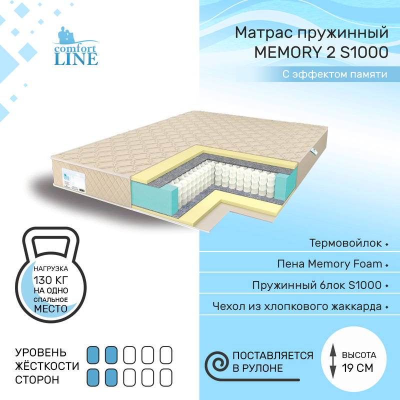 Анатомический ортопедический матрас с эффектом памяти формы Memory 2 S1000. Пружинный, независимый пружинный блок S1000 (1000 пружин на спальное место). Предельно мягко принимает поступающую нагрузку и поддерживает позвоночник. Две рабочие стороны в одном матрасе. Пена Мемори - снимает напряжение с мышц тела и позвоночника, прекрасно расслабляет тело и способствует крепкому и здоровому сну. Пышная обивка из хлопкового жаккарда стегана на холлконе (200 гр) придает матрасу дополнительную высоту и комфорт. Чехол – съемный. Высота модели – 19 см. Максимальная нагрузка на одно спальное место – 130 кг. Жесткость - Полумягкий. Матрас Двусторонний с одинаковой жесткостью. Состав матраса: Состав матраса: Жаккардовый чехол (200 гр.холлкона), Меморикс 2 см., Войлок, Независимый блок S1000, Войлок, Меморикс 2 см. Срок службы, согласно результатам испытаний, более 10 лет. Поставляется в рулоне, в вакууме, легко перевозить в багажнике автомобиля. Не содержит токсинов и вредных химических веществ. Только гипоаллергенные материалы. Надежность и прочность. Безопасен для детей и взрослых. Подходит для подвижных и активных детей. Поддерживает позвоночник в правильном положении. Быстро снимает физическую усталость. Обеспечивает бережную «точечную» поддержку позвоночника. Снимает мышечное напряжение. В наличии все сертификаты на материалы.