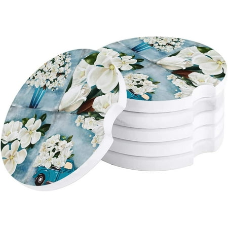 ZHANZZK White Magnolia Flower Vase and Truck Oil Painting Set of 2 Car Coaster for Drinks Absorbent Ceramic Stone Coasters Cup Mat with Cork Base for Home Kitchen Room Coffee Table Bar Decor