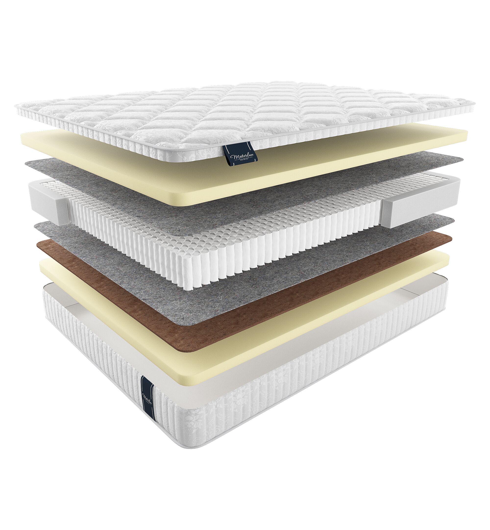 Описание:Умеренно мягкий пружинный матрас со сторонами с различным эффектом.Первая из сторон содержит расслабляющий и запоминающий контуры тела Мemory Foаm.Вторая состоит из сочетания Мemory Foаm с латексированным кокосом, прибавляющим всей конструкции необходимую долю прочности и плотности.Независимый пружинный блок с большим количеством пружин на спальное место дает максимальную поддержку контуров тела во время сна.Модель идеально подойдет всем любителям обволакивающих мягких матрасов.Наполнение:Чехол ("Brera". Ручки для переворачивания. Аэраторы. Смотровая молния).Мемориформ 5 см ("Memory foam". С эффектом памяти, плотность 30 кг/куб.м.).Термофиксированный фетр от 0,5 см.Независимый пружинный блок Мультипакет 13 см ("Multipocket". Усиление "пенополиуретан по периметру плотностью 32 кг/куб.м. и толщиной 7 см").Термофиксированный фетр от 0,5 см.Кокосовая койра - латексированное кокосовое волокно 1 см (плотность 100 кг/куб.м.).Мемориформ 5 см ("Memory foam". С эффектом памяти, плотность 30 кг/куб.м.).Чехол ("Brera". Ручки для переворачивания. Аэраторы. Смотровая молния).