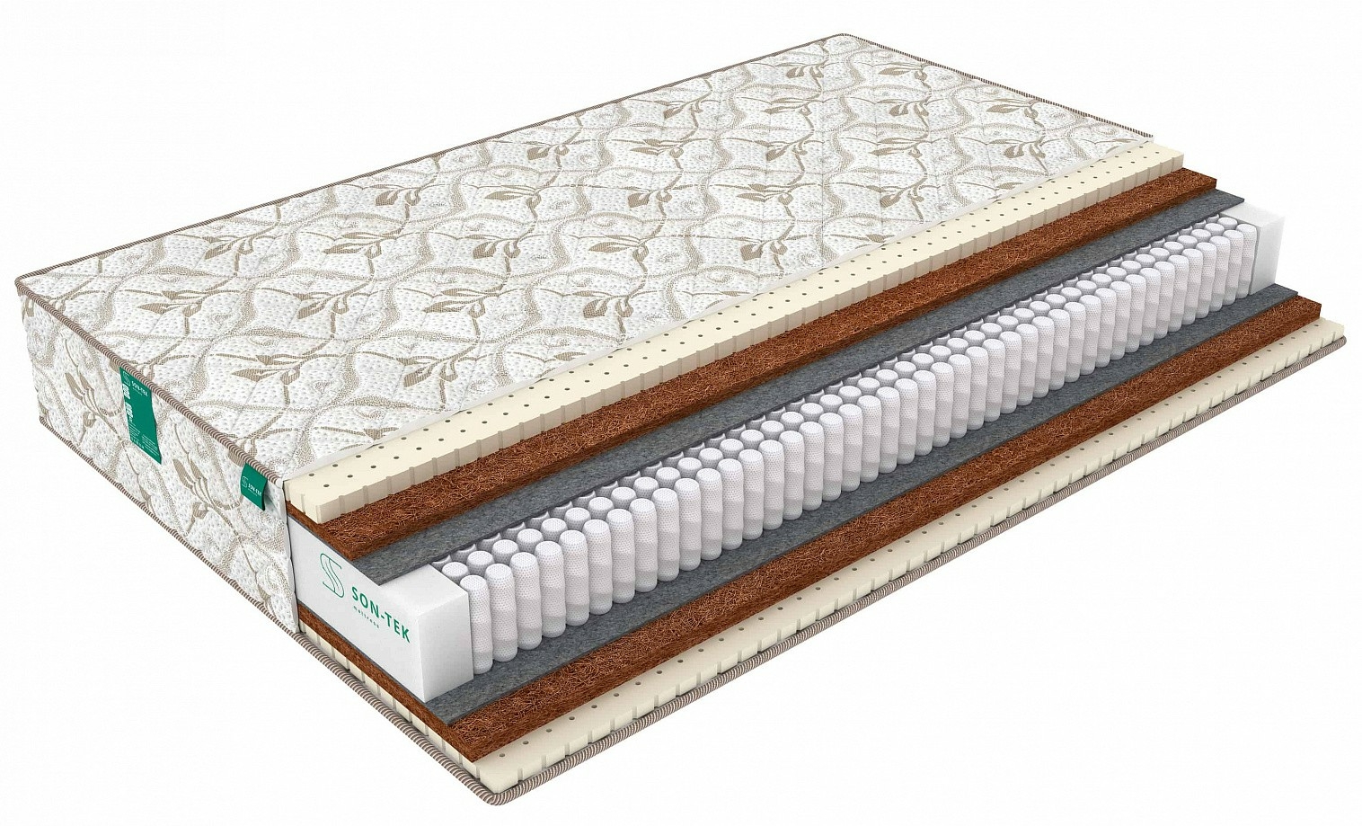 Описание:Модель с разной жесткостью сторон умеренно-мягкой и умеренно-жесткой. Наполнителями служат натуральные материалы койра кокоса и латекс. Различная жесткость спальных поверхностей достигается благодаря чередованию высот этих наполнителей.Толщина слоя койры: с жесткой стороны 2 см, с более мягкой 1 см. Толщина слоя латекса: с жесткой стороны 1 см, с более мягкой 2 см. Оба наполнителя хорошо вентилируются, не накапливают пыль и неприятные запахи.В основе матраса блок независимых пружин S1000. Высокая плотность пружин в таком блоке обеспечивает равномерное распределение нагрузки по всей поверхности матраса и гарантирует поддержку позвоночника. Блок пружин отделен от наполнителей слоями термовойлока,он защищает наполнители от контакта с пружинами и продлевает срок службы матраса. По периметру матраса предусмотрено усиление из плотной пены, что продлевает срок эксплуатации матраса.Наполнение:Чехол ("Perfect").Натуральный латекс 2 см.Кокосовая койра - латексированное кокосовое волокно 1 см.Термопресованный войлок от 0,5 см.Независимый пружинный блок Мультипакет ("Multipocket S1000". Усиление "пенополиуретан по периметру").Термопресованный войлок от 0,5 см.Кокосовая койра - латексированное кокосовое волокно 2 см.Натуральный латекс 1 см.Чехол ("Perfect").