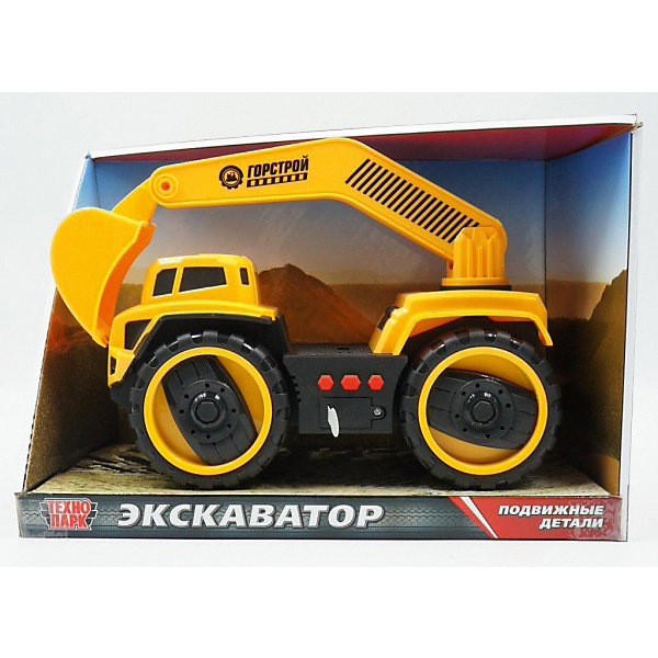 Экскаватор имеет оригинальный дизайн, крупные колеса и подвижную стрелу с ковшом. При нажатии кнопок издаются характерные звуки, включается подсветка. Модель приходит в движение, если поставить ее на ровную поверхность и оттянуть назад.
