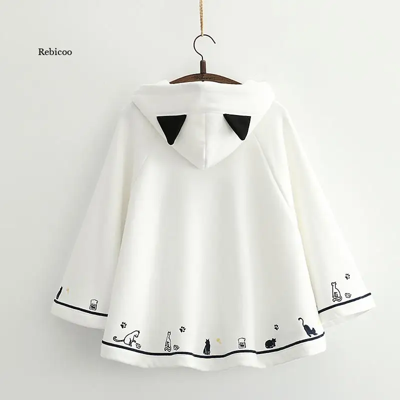 Solid black cartoon cat print cute hoodies and hooded sweatshirts winter fleece thick batwing sleeve pullover Tracksuits