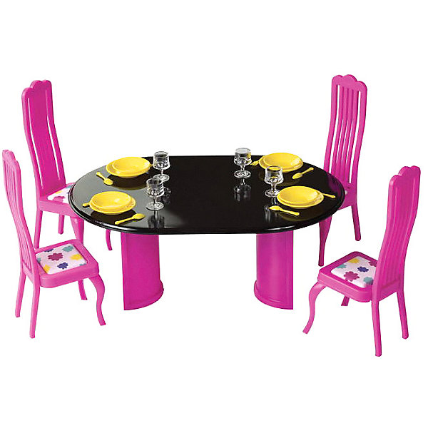 В игровом наборе представлены миниатюрные копии мебели в виде обеденного стола со стульями, с помощью которых девочки могут обустроить столовую в кукольном домике.