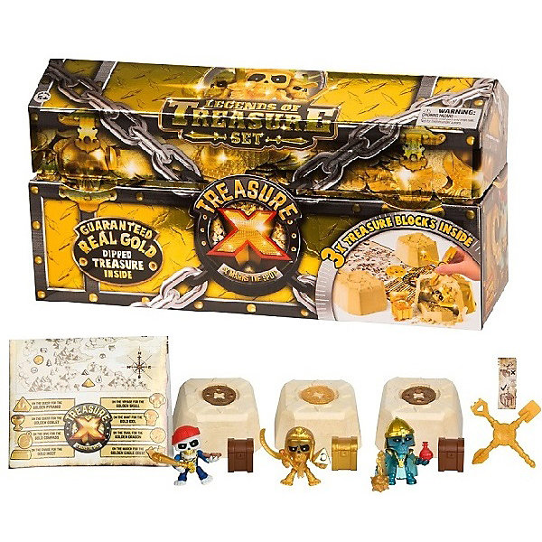 Набор Treasure X «В поисках сокровищ» представляет квест, в котором с помощью карты и монеток детям предстоит найти пиратов и охотников, оружие и сундуки с сокровищами. Фигурки собирается по частям как конструктор, а если повезет, внутри сундука отыщется реликвия, покрытая настоящим золотом. Сундук растворяется в воде.