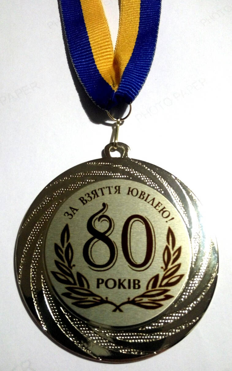 Медаль 80 років За взяття ювілею - визначна нагорода для ювіляра, якому виповнилося 80 років. Восьмидесятиріччя відзначають в родинному колі, запрошують найкращих друзів, та колег по роботі. Медаль 80 років виготовлена з металу, зверху покритого золотистим кольором. Нагорода вішається на шию ювіляра за допомогою стрічки жовто-блакитного кольору. Можлива додаткова опція - нанесення на реверсі медалі індивідуального напису. Вартість послуги - 40 грн.