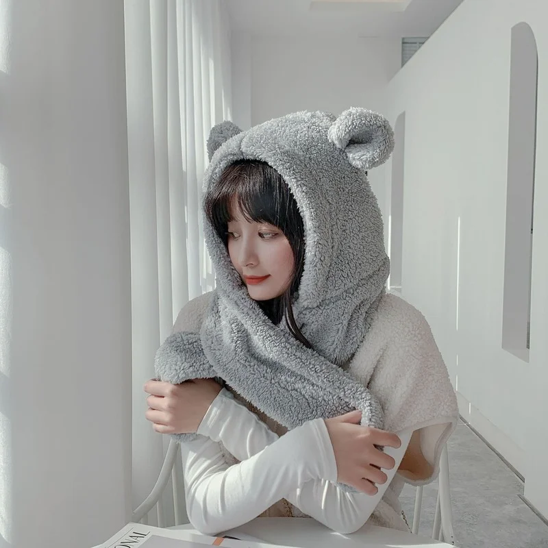Медвежья шапка с ушами из шерсти ягненка короткий слюнявчик Милая универсальная шапка шарф в одном
