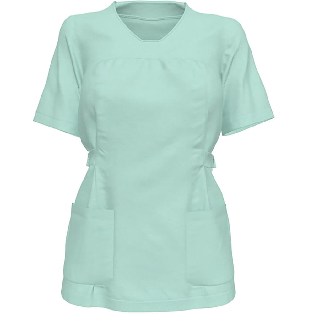 Нежно-зеленая женская блуза от хирургического костюма с короткими рукавами и приталенным силуэтом без воротника имеет U-образный вырез и два накладных кармана. Длина блузы – до линии бедра.