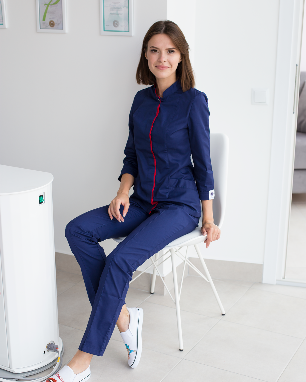 Медицинский женский костюм на кнопочках. Цвет: сапфир. Ткань: 35% — хлопок, 65% — полиэстер. Имеет 2 кармана на куртке. Четвертной рукавчик.