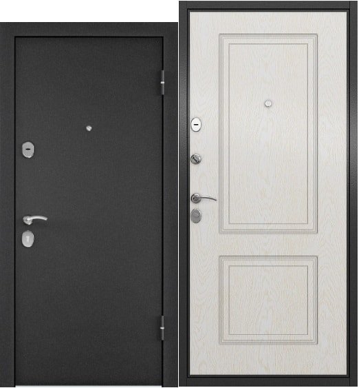 металл: 0.8 мм, открытые петли 2 шт., два замка (цилиндровый + сувальдный), отделка: полимерно-порошковое покрытие (снаружи), МДФ плёночный (внутри)