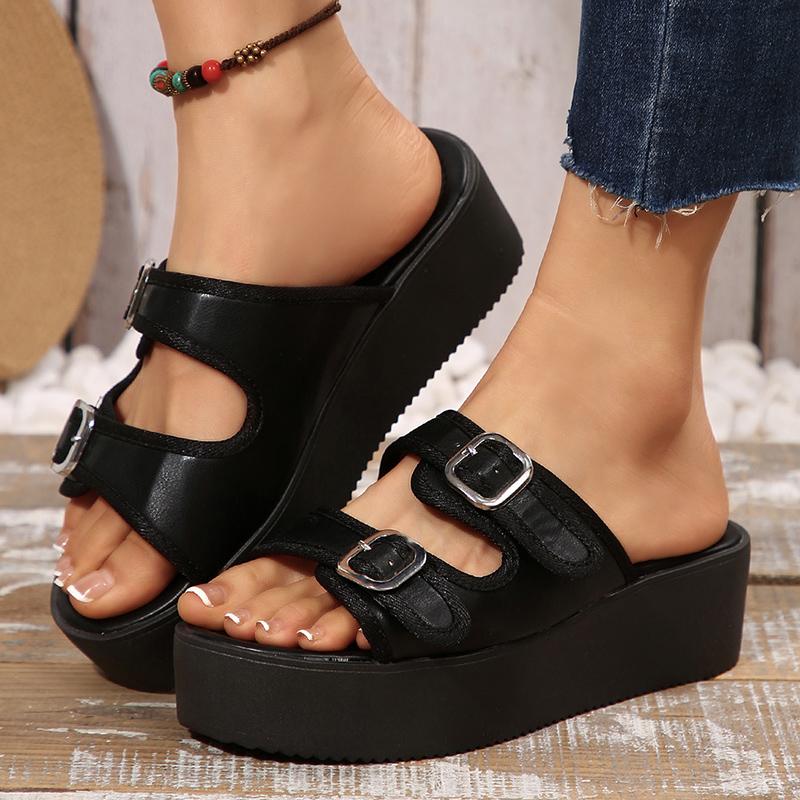 Металлическая двойная пряжка толстая подошва панк тапочки женские модные сандалии на толстой платформе женские летние нескользящие уличные пляжные шлепанцы 43 чёрный