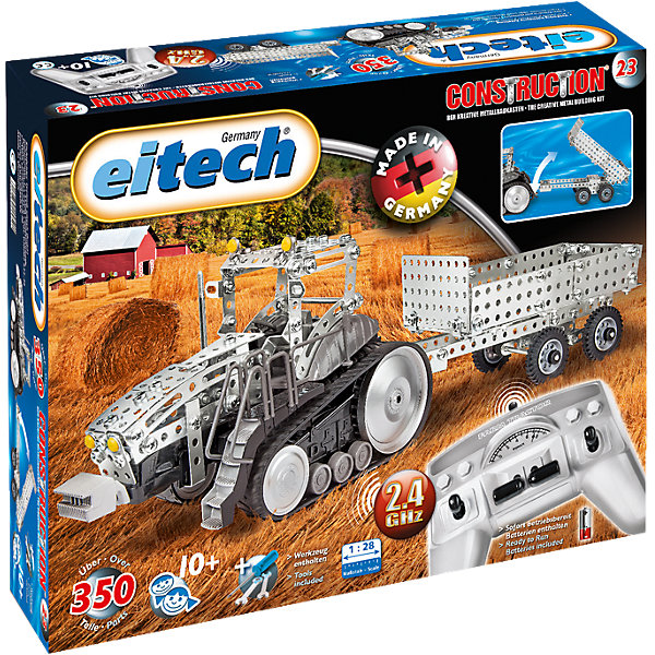 Металлический конструктор Eitech «Трактор с прицепом на радиоуправлении» состоит из 270 деталей, при помощи которых можно собрать мельницу, подъёмный кран и п-образный кран. Крюки у кранов можно двигать, также как и лопасти ветряной мельницы можно вращать. Конструктор собирается при помощи болтов, гаек и специального инструмента.