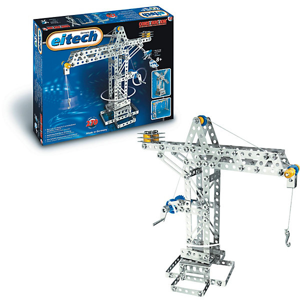 Металлический конструктор Eitech «Кран» состоит из 270 деталей, при помощи которых можно собрать мельницу, подъёмный кран и п-образный кран. Крюки у кранов можно двигать, также как и лопасти ветряной мельницы можно вращать. Конструктор собирается при помощи болтов, гаек и специального инструмента.