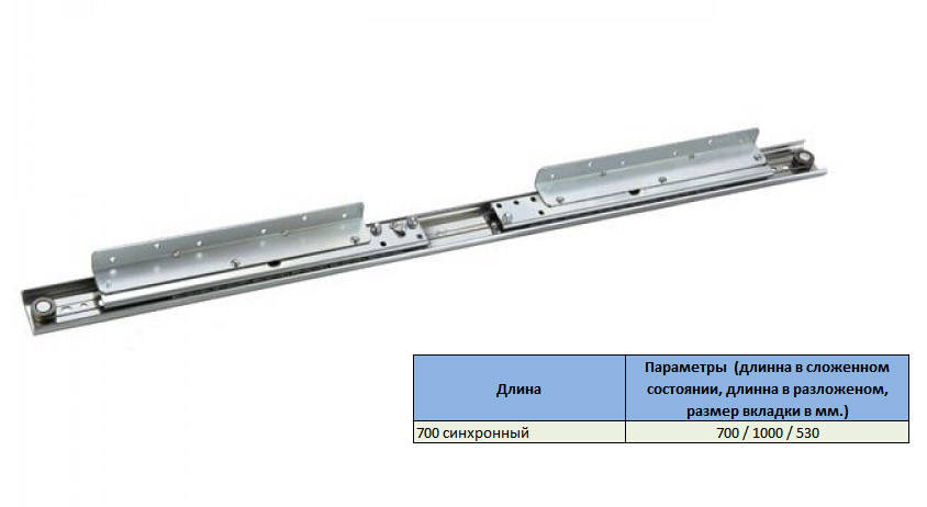 Раздвижной механизм L700 синхронный. Длинна механизма в сложенном состоянии 700 мм, полностью разложенное 1000 мм, размер для вкладки 530 мм. В данном варианте, идеально применять вкладыш 500 мм, запас в 30мм позволяет удобно устанавливать вкладку в процессе эксплуатации стола.