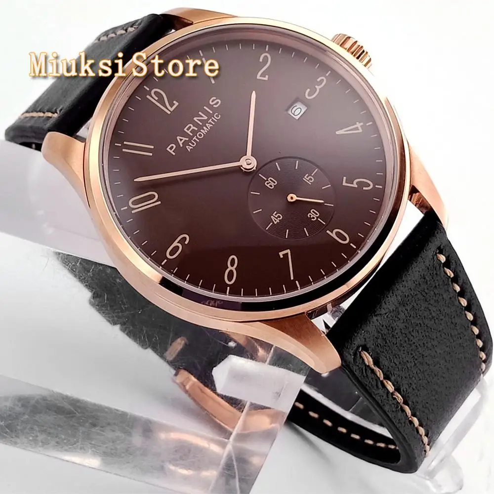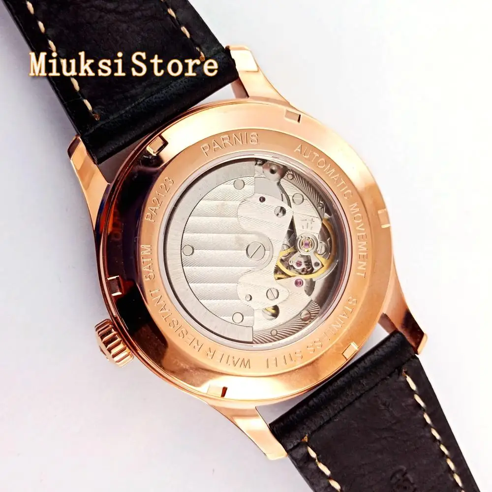 Механические наручные часы Parnis, 41 мм, циферблат цвета розового золота, кожа, автоматический механизм