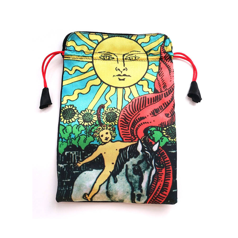 Размер мешочка 21х14 см, т.е. в него поместится даже колода увеличенного размера. Выполнен из атласа, печать долговечная и не линяет. Ткань двойная (внутри подкладка тоже из атласа, подкладка черного цвета).