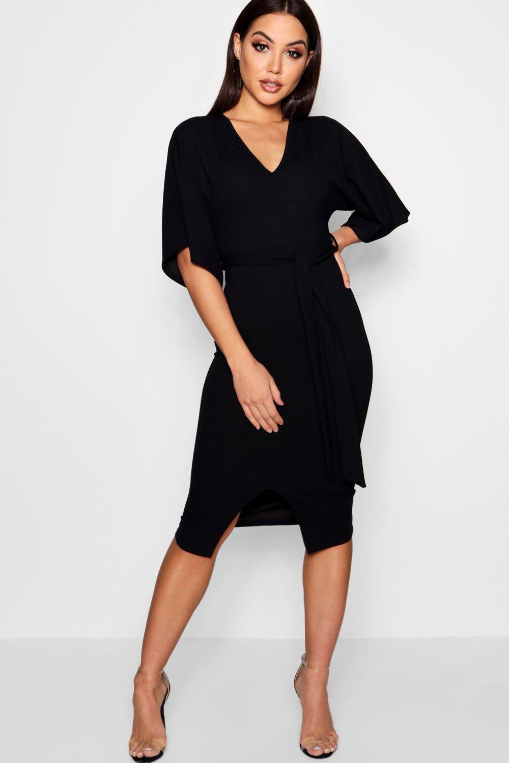 Миди платье с разрезом спереди с рукавами в стиле кимоно, Black