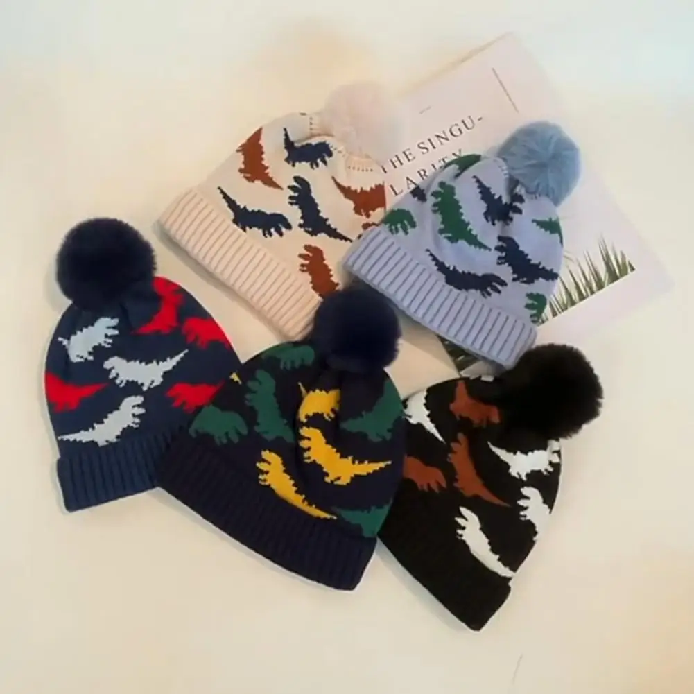 Милая Детская Шапка-бини с мультяшным динозавром, плюшевый мяч, сезон осень-зима, вязаная шапка для малышей с закрученными краями, для повсе...