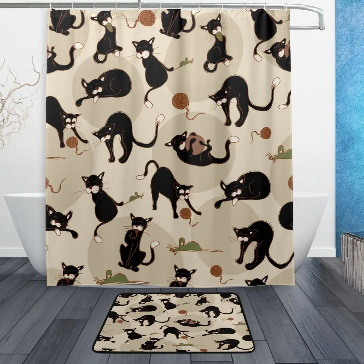 Милая Черная кошка, игровой мяч, водонепроницаемая полиэфирная ткань, занавеска для душа с крючками, коврик для ванной, напольный коврик для...
