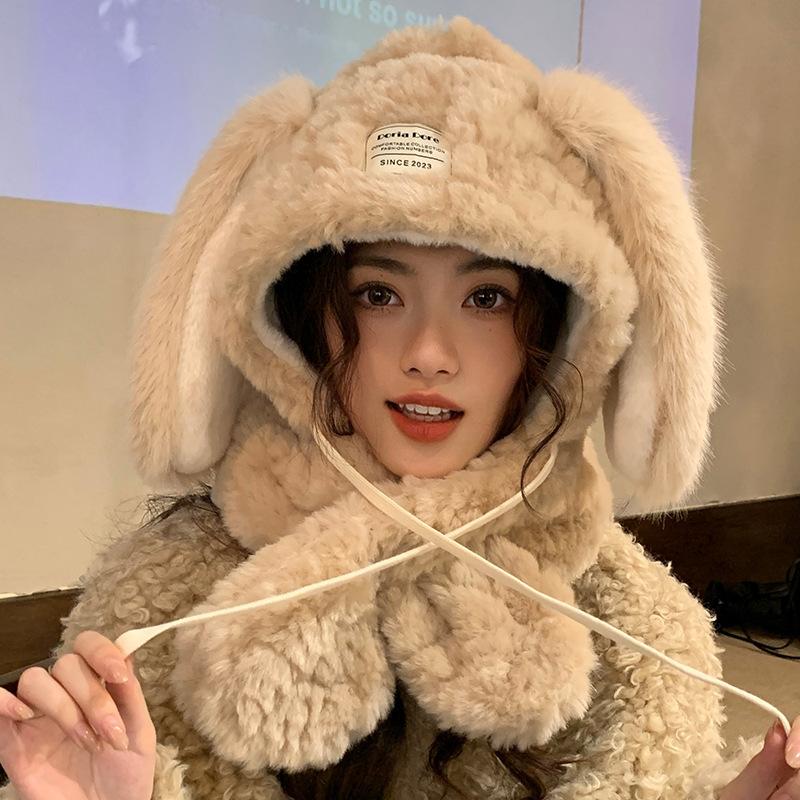 Милая и модная плюшевая шапка с длинными кроличьими ушами в корейском стиле для женщин, теплая и универсальная, подчеркивающая лицо, с защитой ушей и шеи One Size