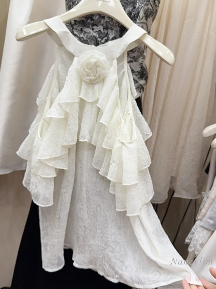 Милая популярная рубашка для девушек с оборками и открытыми плечами, женская летняя Свободная шифоновая блузка с лямкой на шее и цветочным принтом в виде листьев лотоса, праздничный Топ