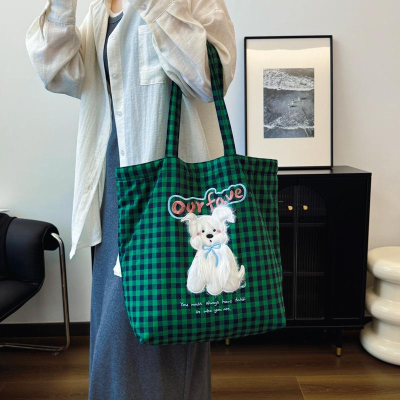 Милая сумка через плечо с вышитым плюшевым щенком, большая вместительная клетчатая сумка, студенческая тканевая сумка, повседневная сумка-тоут, женская сумка зелёный