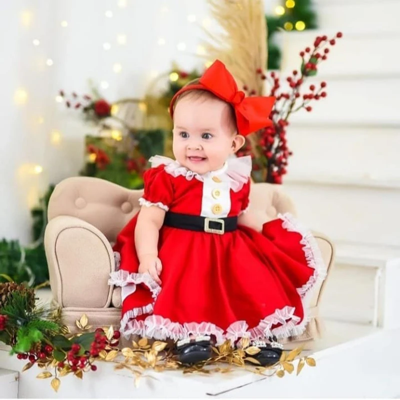 Милое рождественское платье для маленьких девочек, Сетчатое лоскутное платье с коротким рукавом, пуговицами спереди и черным поясом