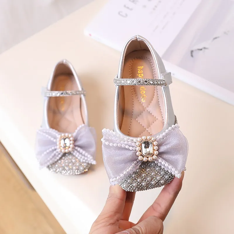 Милые детские модные туфли для девочек с бантом и жемчужинами из горного хрусталя, с квадратным носком, весенний сезон 2023, универсальные туф...