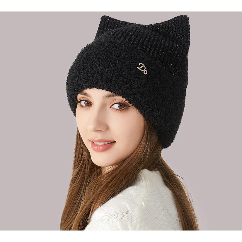 Милые кошачьи ушки для девочек (Хлеб в форме кошачьих ушей, приготовленный на пару) зимой утолщенная вязаная шапка для защиты ушей универсальная однотонная шерстяная шапка One size чёрный
