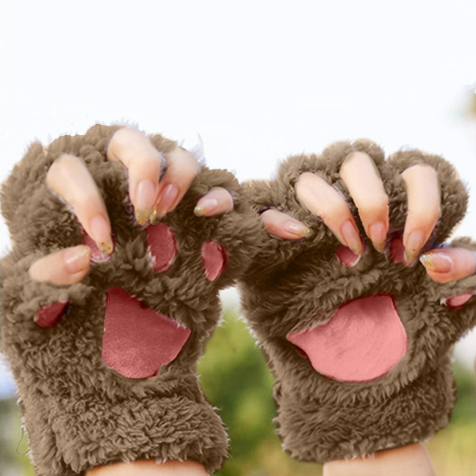 Милые пушистые перчатки без пальцев с кошачьими лапками, зимние теплые плюшевые варежки для женщин, мягкие термальные перчатки с полупальцами и рисунком из мультфильма, подарки для девочек One Size