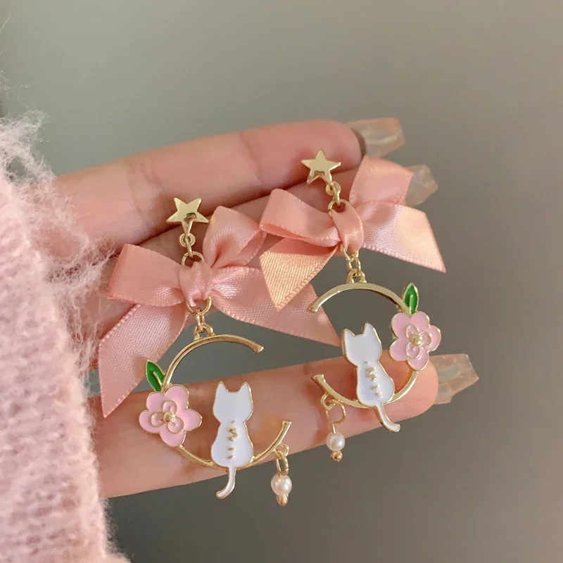 Милые розовые серьги с бантом в виде кошки на Луне, милые маленькие серьги в японском стиле с цветком Сакуры и кошкой для женщин