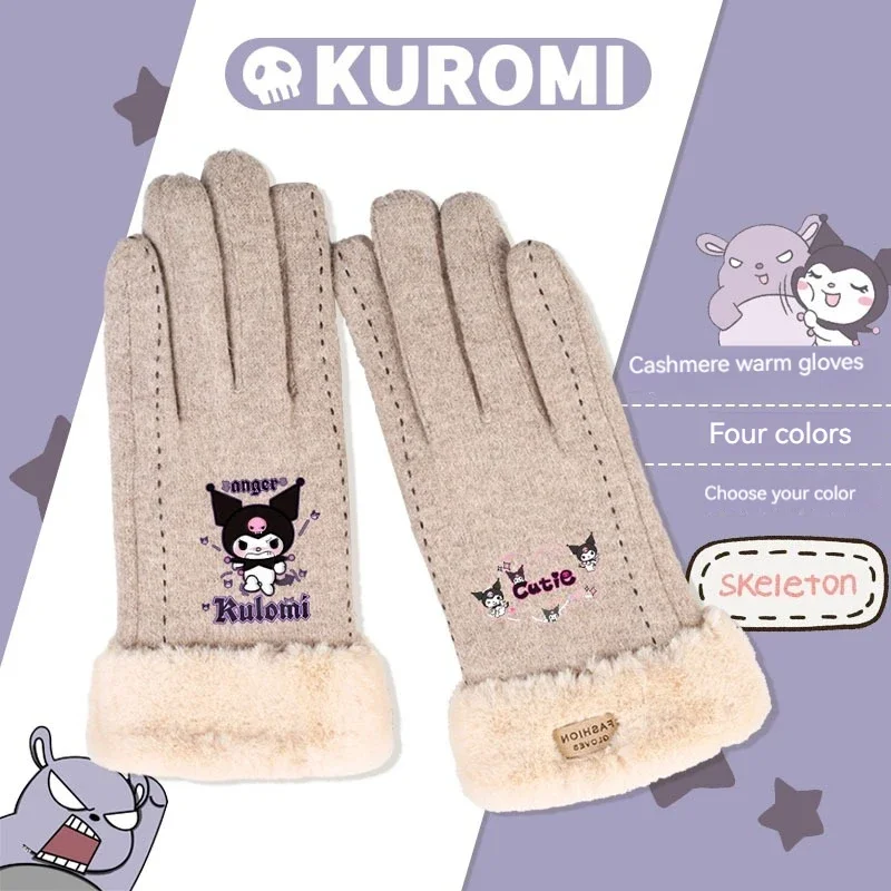 Милые шерстяные зимние плюшевые теплые и уплотненные холодностойкие перчатки Kuromi для верховой езды на электромобиле детский подарок