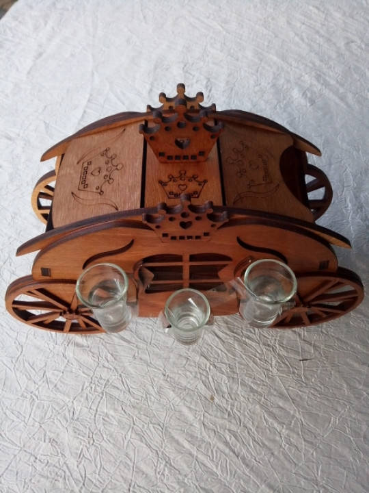 Мини-бар Карета с рюмками Набор "КАРЕТА" представляет собой комплект из деревянной подставки для бутылки в форме кареты и стеклянных стопок в количестве 6 штук. Подставка-карета имеет ширину 30 см, высота составляет 21 см, а глубина равна 20 см. Все детали вырезаны лазером из фанеры и покрыты бесцветным лаком. Лак не имеет запаха, а сама подставка имеет приятный древесный аромат. «КАРЕТА» отлично подойдёт для украшения банкетного стола, а также станет маленьким, но приятным элементом в интерьере любого помещения. Также такой набор может послужить хорошим и практичным подарком для близких и друзей. Найти другие оригинальные идеи для интерьера Вы можете в интернет магазине Xatynka https://xatynka.com.ua ПО САМЫМ ПРИТЯГАТЕЛЬНЫМ ЦЕНАМ!