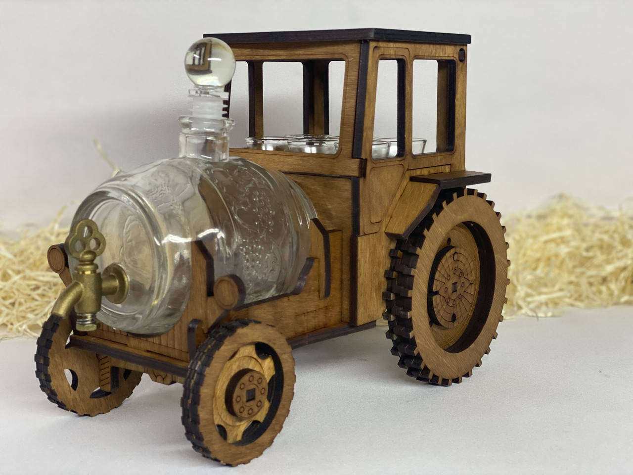 Уникальный бар в виде Трактора выполнен из натурального дерева - березовой фанеры. Выглядит очень оригинально! Прекрасно подойдет как для подарка, так и для украшения интерьера.В кабине трактора - уютно расположились 6 стеклянных рюмочек (в комплекте).А на переднюю ось трактора поместилась стеклянная бочка 0.5 л,в какую можно налить любимый напиток.Бар упакован в ПВХ пленку и транспортировочную картонную упаковку (это не подарочная коробка, обычный картон - для транспортировки товара). Размеры Трактора (220*265*160 мм).Объем 6 рюмок по 25 мл. Смотрите все обьявления на нашем сайте-https://svit-dekor.com.ua/