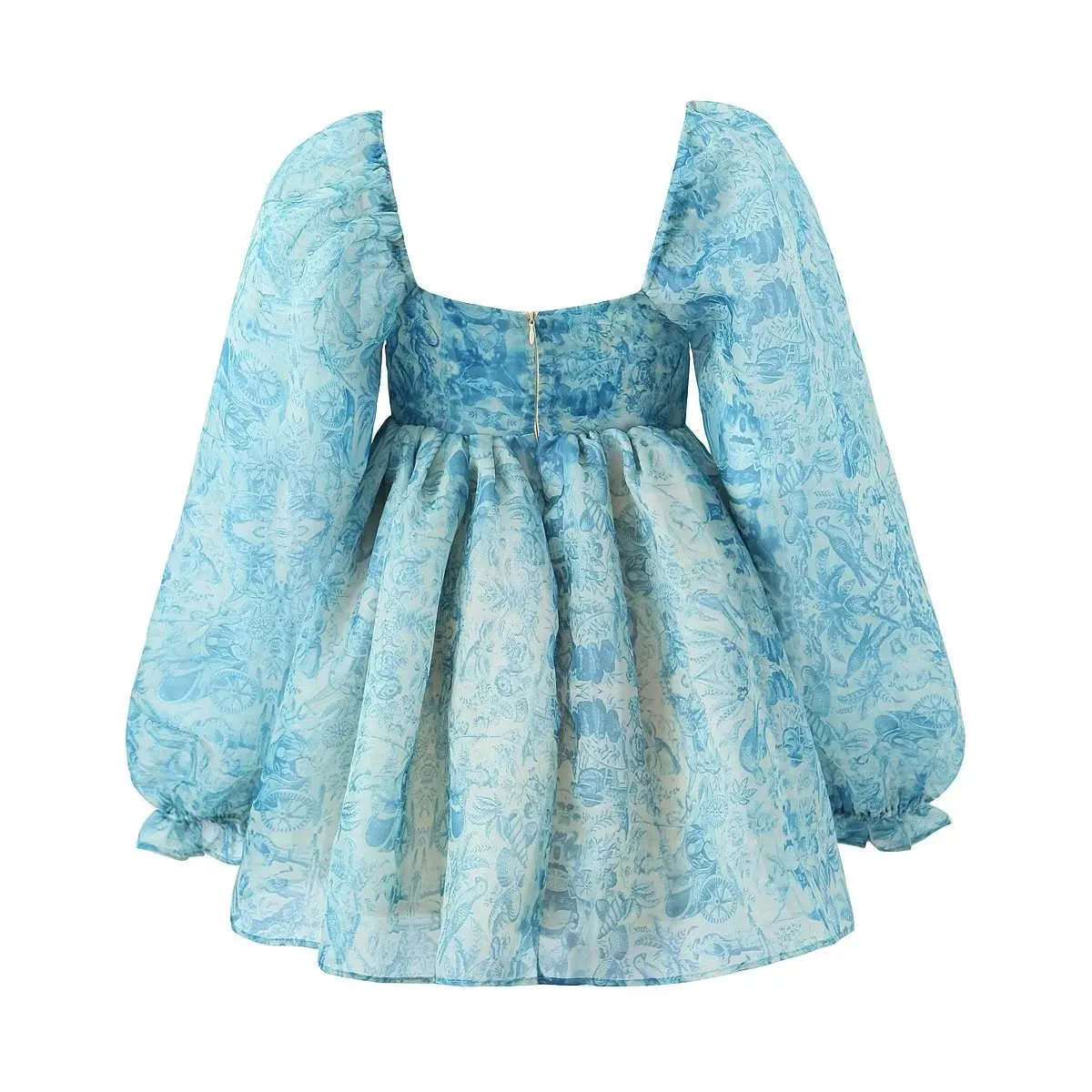 Мини-платье женское летнее из органзы с цветочным принтом и квадратным вырезом