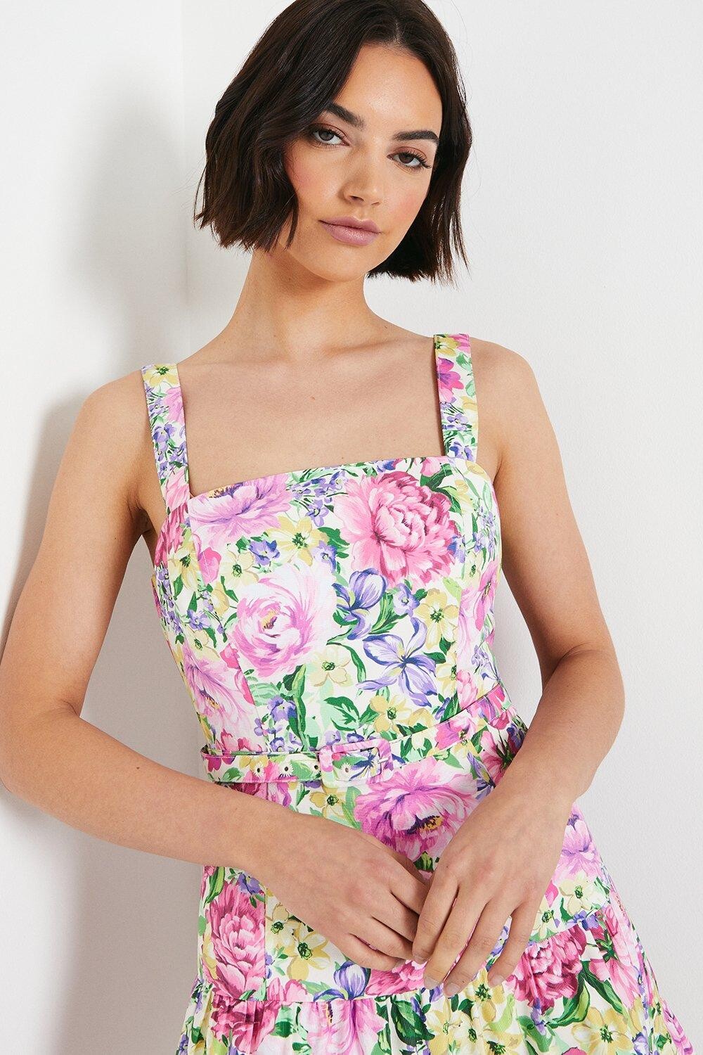 Тканое мини-платье с ярким цветочным принтом и квадратным вырезом. Регулируемые бретели для индивидуальной посадки. Привлекательный пояс на талии, подчеркивающий фигуру. Расклешенная юбка с многоярусной оборкой по краю для большей свободы движений. Вся подкладка для гладкой отделки. Источает женское очарование это мини-платье с цветочным принтом идеально подходит для особых случаев, таких как свадьбы или скачки. или официальные мероприятия. Яркий принт и многоярусная юбка с рюшами создают романтический образ. причудливый вид. Сочетайте его с туфлями на каблуке и изящными украшениями, чтобы создать шикарный образ. изысканный ансамбль, излучающий элегантность и изысканность. Собираетесь ли вы на вечеринку в саду или на летний вечер это платье обязательно привлечет внимание и оставит неизгладимое впечатление.