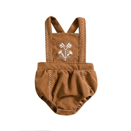 LSFYSZD Infant Girls Casual Corduroy Romper Square Collar Floral Embroidery Pattern Sleeveless One-piece Brown/ Light Brown
