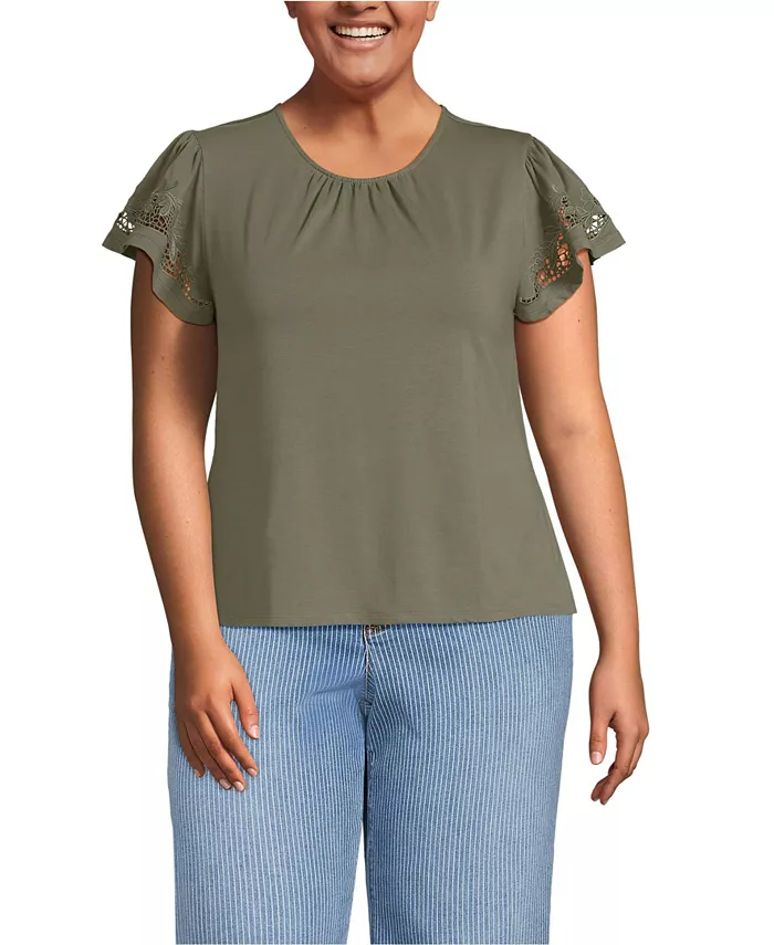 Женский легкий трикотажный топ больших размеров с круглым вырезом и оборками на рукавах, струящийся Lands' End