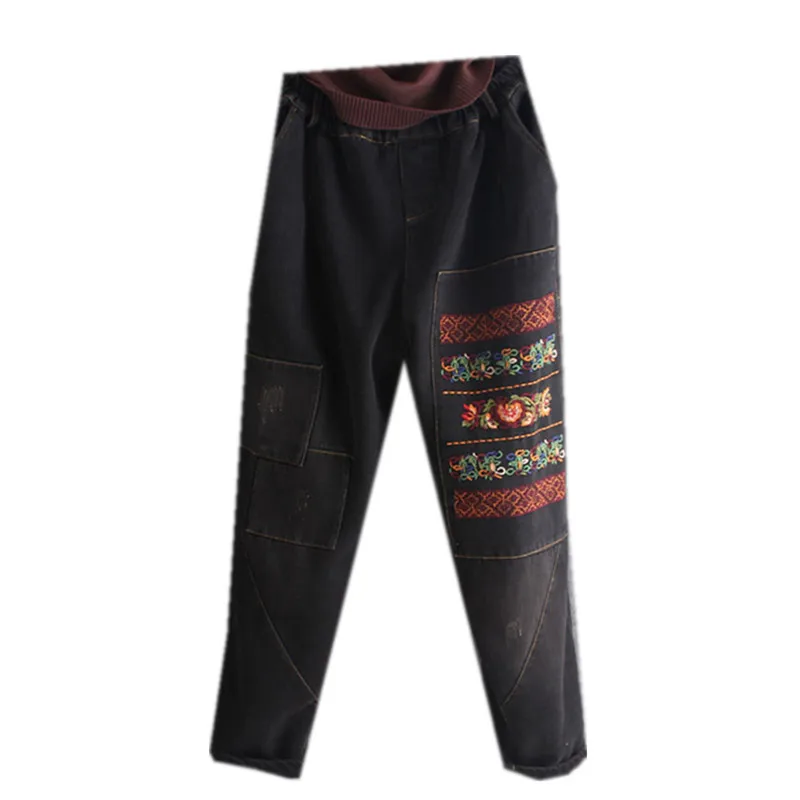 Women Winter Fall Fashion Baggy Harem Streetwear Jeans Female Embroidery Folk Style Fleece Loose Casual Vintage Denim Pants