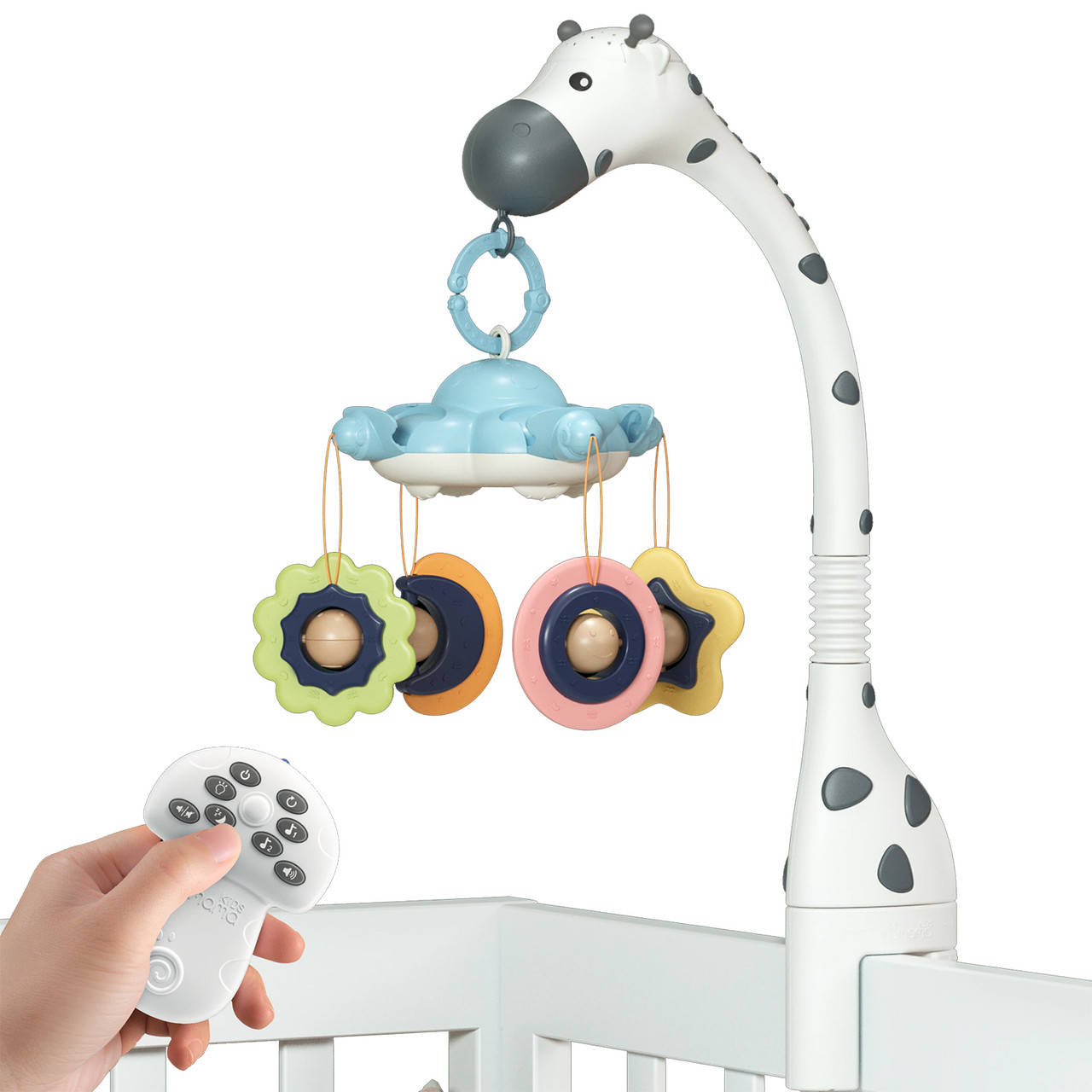 Мобиль на кроватку Tumama Жираф с проекцией и музыкой Белый — это самый настоящий центр развлечений для вашего малыша. Мобиль с проектором звездное небо станет незаменимым помощником для родителей, когда нужно привлечь внимание малыша.Управлять всеми функциями можно при помощи кнопок, расположенных на самом мобиле, или при помощи пульта ДУ, который идет в комплекте. Основные функции мобиля: проекция звездного неба 4 цвета; функция карусели игрушек; 3 группы по 12 мелодий; регулятор громкости; таймер отключения;пульт ДУ.Мотор, вращающий игрушки на мобиле работает плавно и практически бесшумно. Подвесные игрушки выполнены из высококачественного материала, их можно использовать в качестве прорезывателей для зубов.Детский мобиль с проектором на пульте премиального качества изготовлен из нетоксичных материалов, не имеет острых углов. Работает от 3-х батареек ААА.