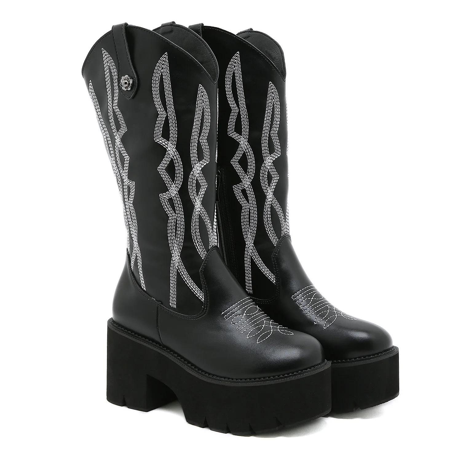 Мода Новые Вышитые Рукава Круглый Носок Ковбойские Сапоги Одна Нога Сапоги Кавалера Толстая Подошва Водонепроницаемая Платформа До Колена Женские Сапоги 35 чёрный