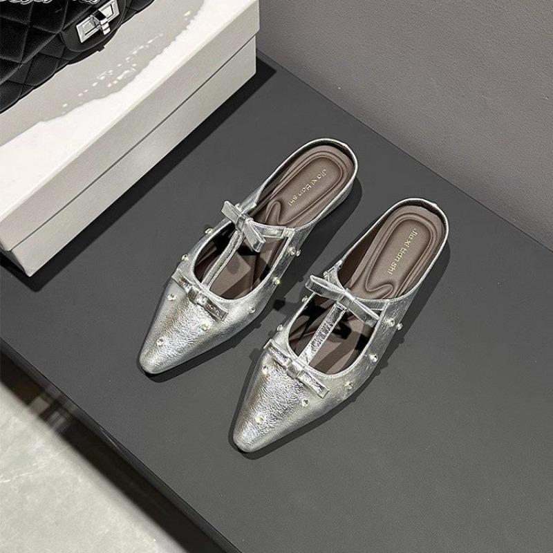 Мода Новый Стиль Популярный Клепка Острый Носок Тонкий Каблук Баотоу Полушлепанцы Женские Средний Каблук Мелкий Вырез Ленивые Туфли Мюли Zapatos Mujer 35 серебряный